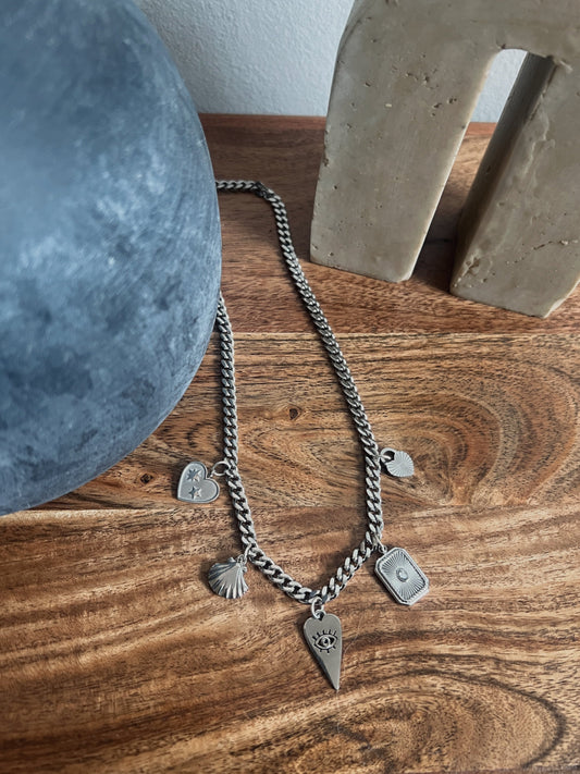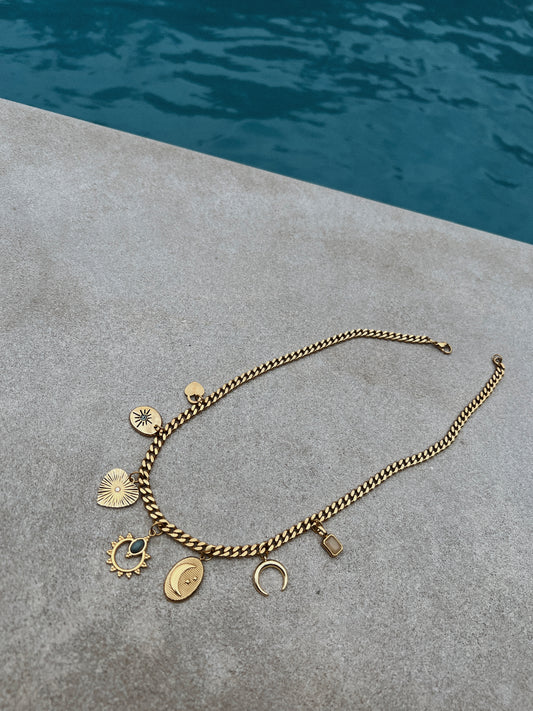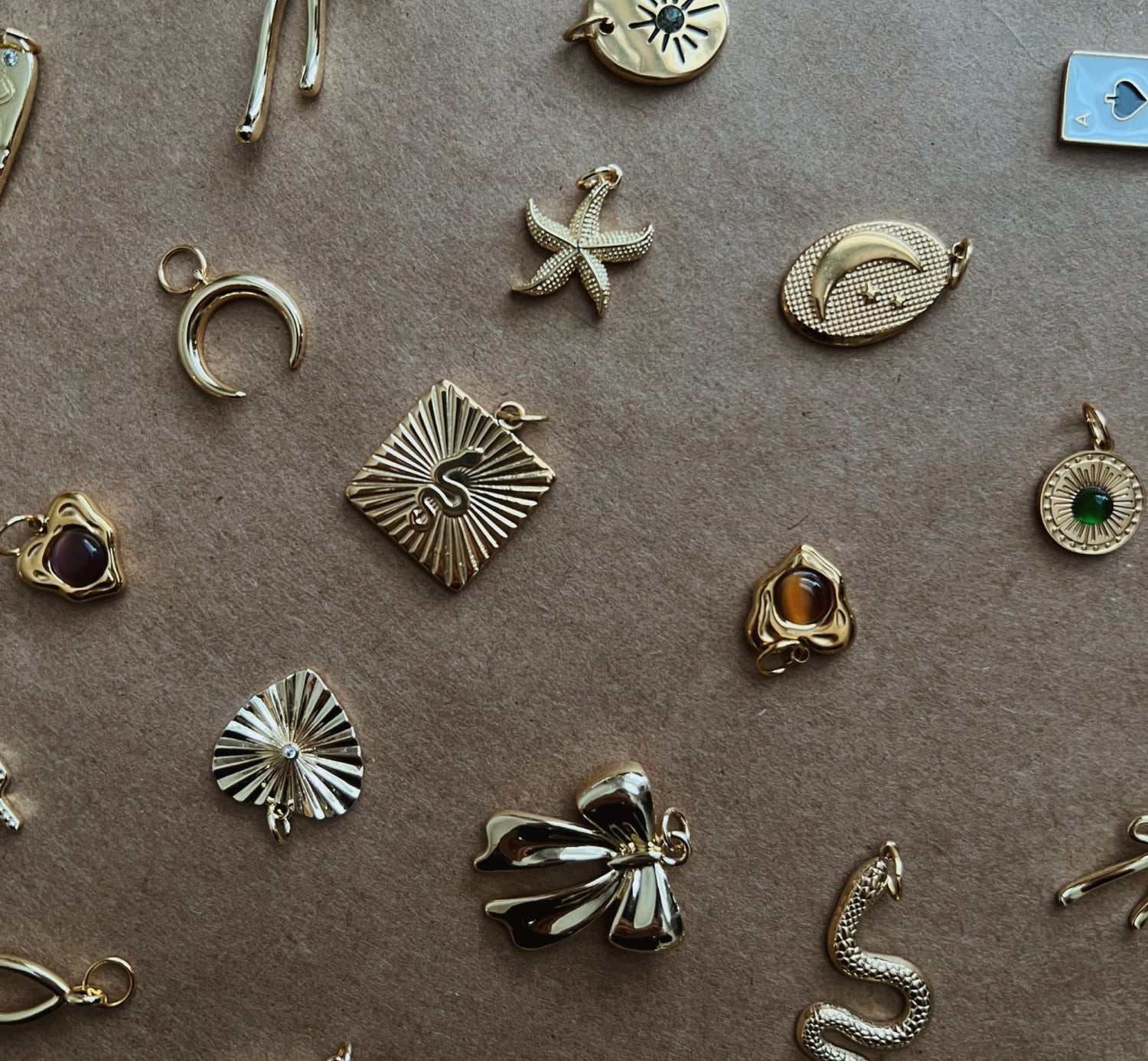 Start by selecting your preferred chain and use our tool to click and place the charm of your choice. We offer a variety of 18k filled gold + silver charm/chain options!