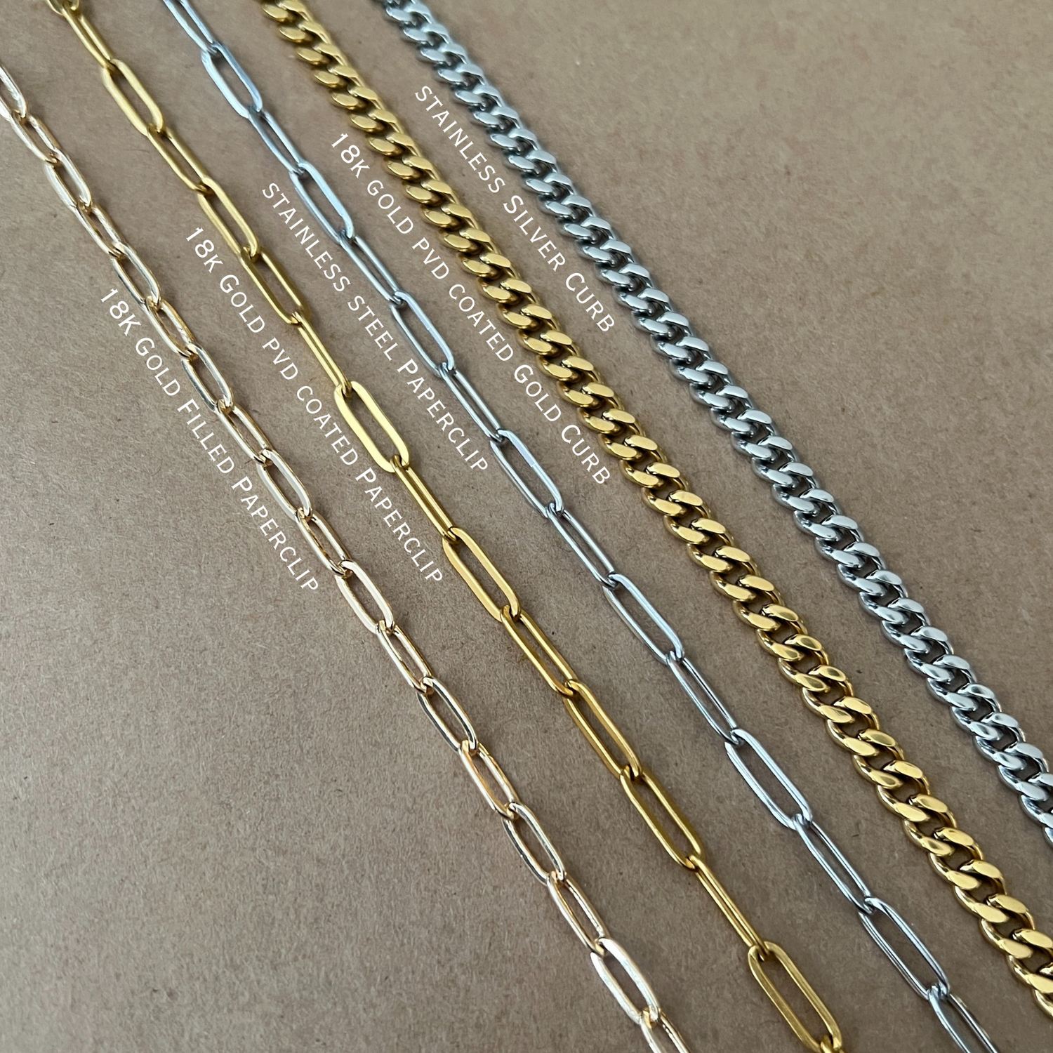 We offer a selection of 18k gold filled, 18k gold PVD coated and stainless steel silver chains. All chains offer a non-tarnish, hypoallergenic, polished finish that will hold up best to everyday wear and will never turn your skin green.