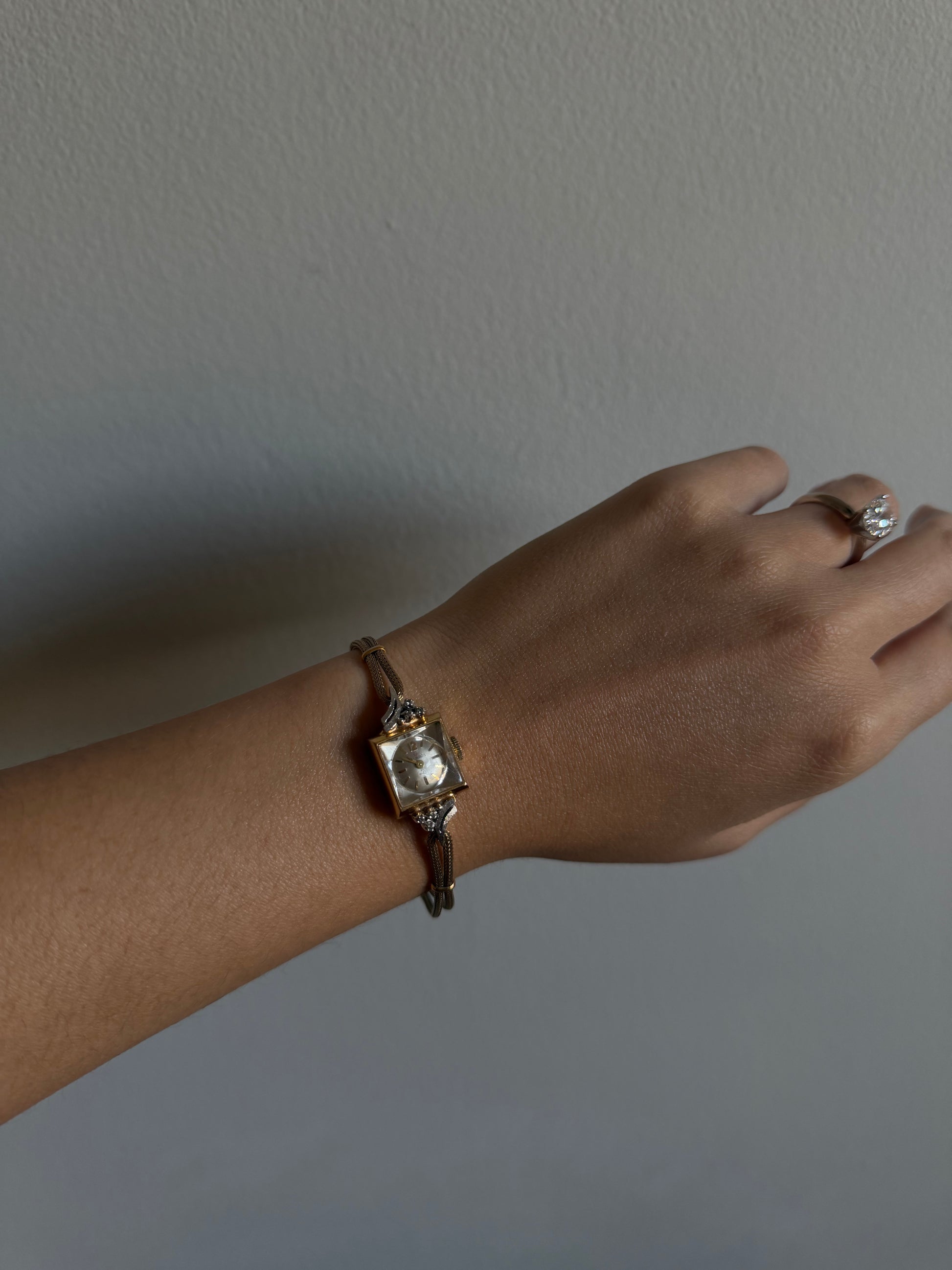 A mid-century vintage Helbros mechanical watch featuring a gold-tone square case and mesh bracelet with delicate decorative detailing. This piece dates to the mid-1900s and carries the classic charm Helbros is known for—elegant, feminine, and timeless in design.
