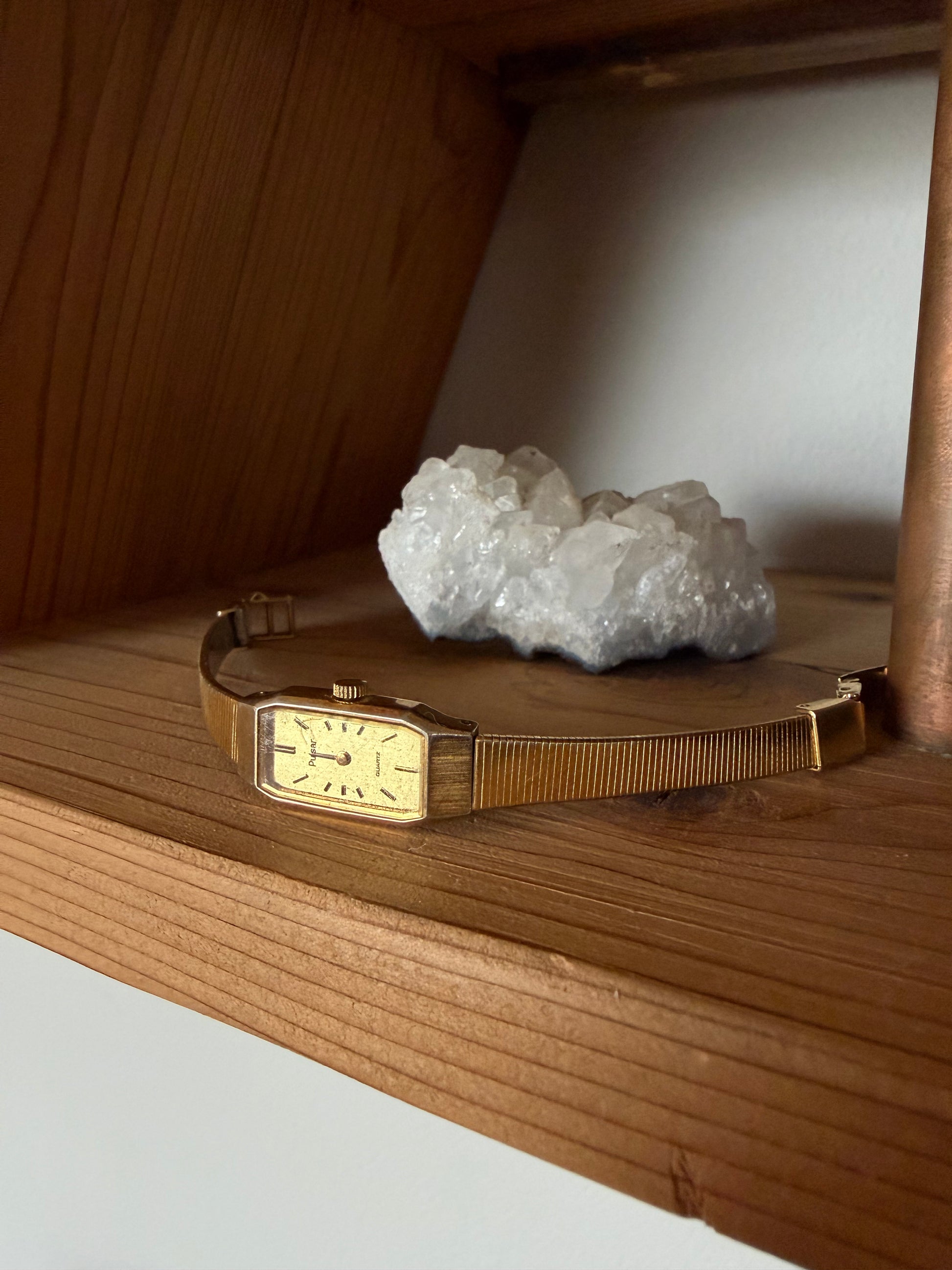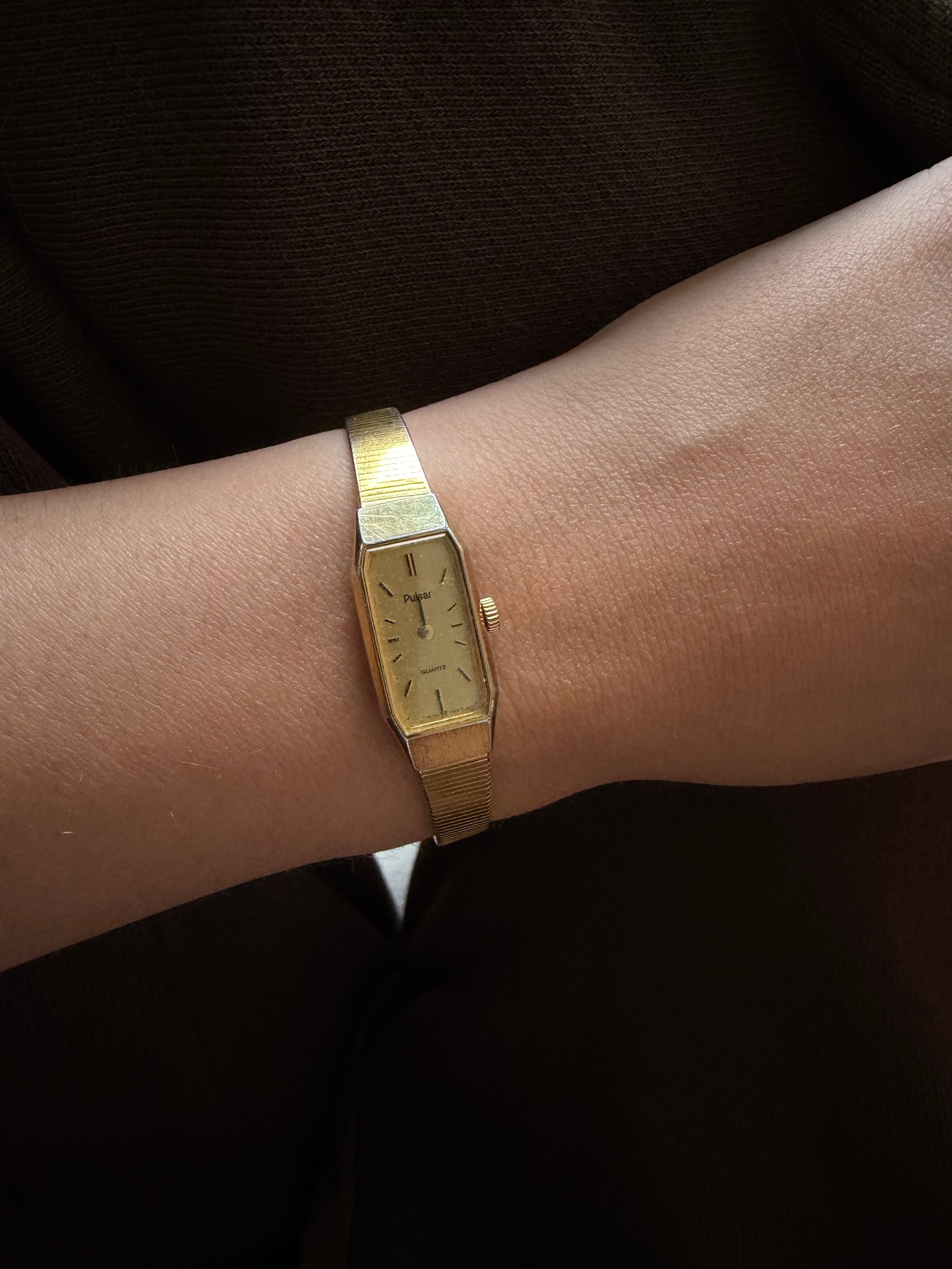 A beautifully aged vintage Pulsar watch with a slim rectangular face and warm gold-tone finish. This piece dates to the 1980s, a decade known for elegant, elongated watch silhouettes and understated design. While the watch is not currently running, it remains a striking piece for styling — perfect worn as a bracelet-style watch or layered with your everyday jewelry.