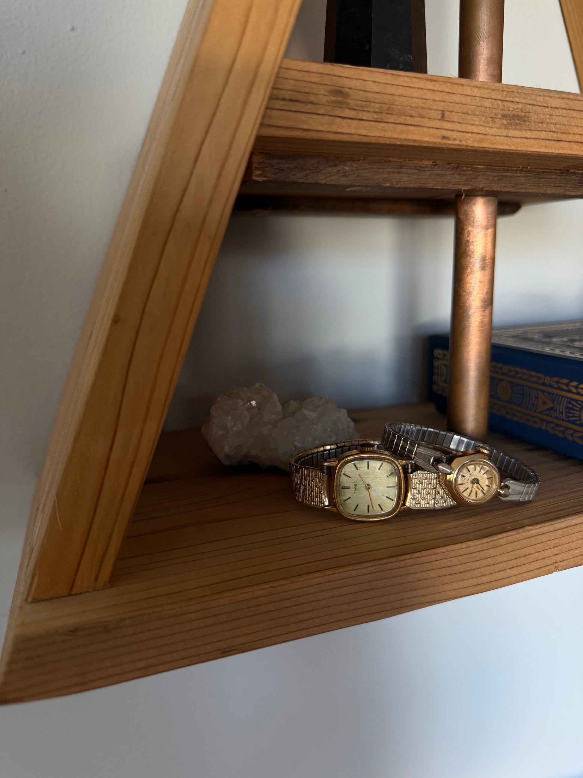 A classic vintage Timex timepiece featuring a softly squared gold-tone case and textured integrated bracelet. The minimalist dial and warm patina give this watch an effortless, lived-in feel — perfect for styling as a bracelet watch or statement accessory.